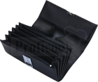 popis: Kožená kasírka se 7 přihrádkami na papírové peníze, dva prostory uzavřené zipem na kovové mince, tři kapsičky na kreditní karty , na hlavní klopně jednoduchá slidová kapsa.