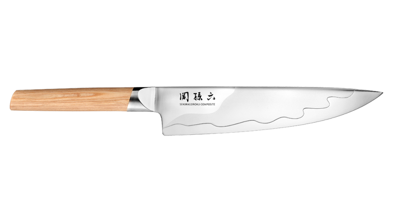 popis: Nová kompozitní řada Seki Magoroku Composite přináší nové technologie z leteckého průmyslu, které se vyznačuji velmi vysokou pevností a extrémní přesností. Čepel kombinuje velmi krásné zpracování dvou různých druhů ocelí, vysoce leštěná část čepele je vyrobena z VG MAX oceli o tvrdosti HRC 61 +/-1, druhá část se saténovým povrchem je z SUS420J2 oceli. Obě oceli jsou spojeny specialní měděnou slitinou, která vytváří čistý detail spojení ocelí. Štíhlá rukojeť je vyrobená ze světlého dřeva pakka.